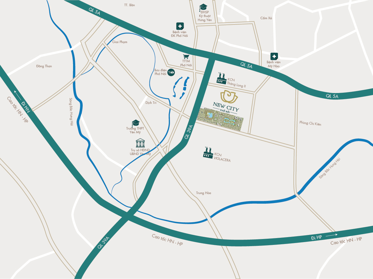 Khu đô thị mới New City Phố Nối nằm tại cửa ngõ phía Bắc của tỉnh Hưng Yên trên trục quốc lộ số 5.